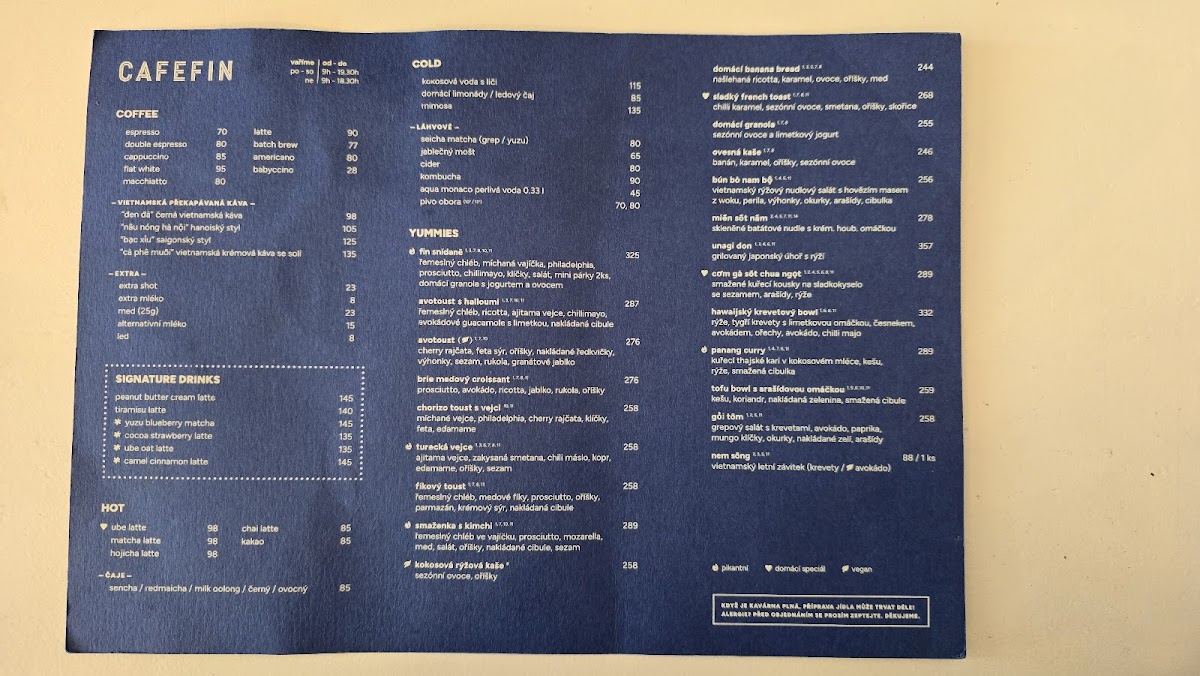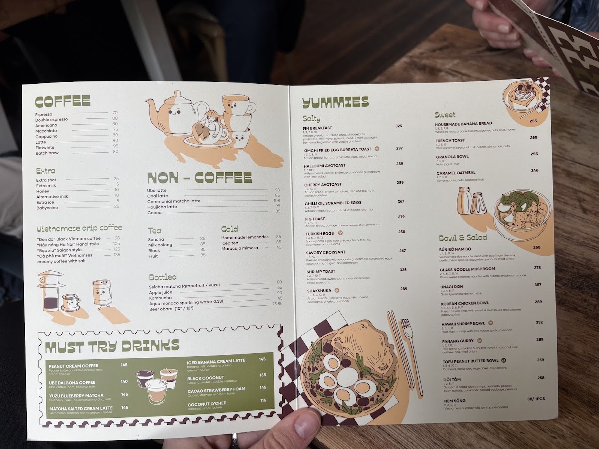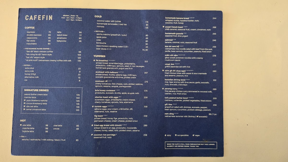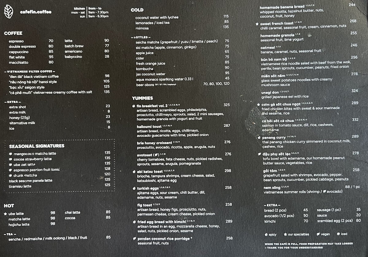 Overall, the menu matches well with Cafefin’s ambiance—comfortable and thoughtfully curated, encouraging visitors to savor both simple pleasures and unexpected flavors throughout their visit.